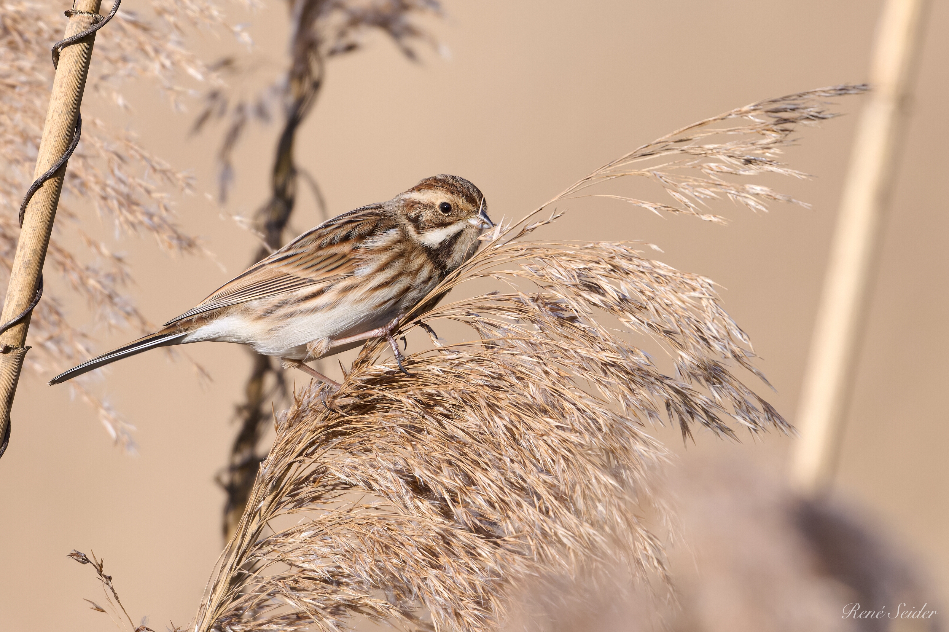 Die Rohrammer ist etwa 13–16 cm lang. Beim Männchen sind im Prachtkleid Kopf und Kehle schwarz, das Nackenband weiß, der Rücken dunkelbraun gestreift, der Bürzel gräulich, die Unterseite gräulich-hell. Nach der Herbstmauser ist diese kontrastreiche Färbung durch graue Federsäume verdeckt und kommt im Verlauf des Winters nach Verschleiß der Federränder wieder zum Vorschein. Das Weibchen ist braun gestreift mit schwarzweißem Bartstreif, die Unterseite heller. Es lässt sich auf dem Zuge nur schwer bestimmen, besonders, wenn man es allein antrifft. Die Rohrammer ernährt sich vorzugsweise von Grassamen und zusätzlich im Sommer von kleinen Insekten, Schnecken und Würmern. Quelle: Wikipedia