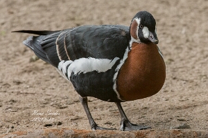 Die Rothalsgans gehört innerhalb der echten Gänse zu den Meergänsen. Die Rothalsgans ist die farblich bunteste der Meergänse. Das Gefieder ist schwarz mit…