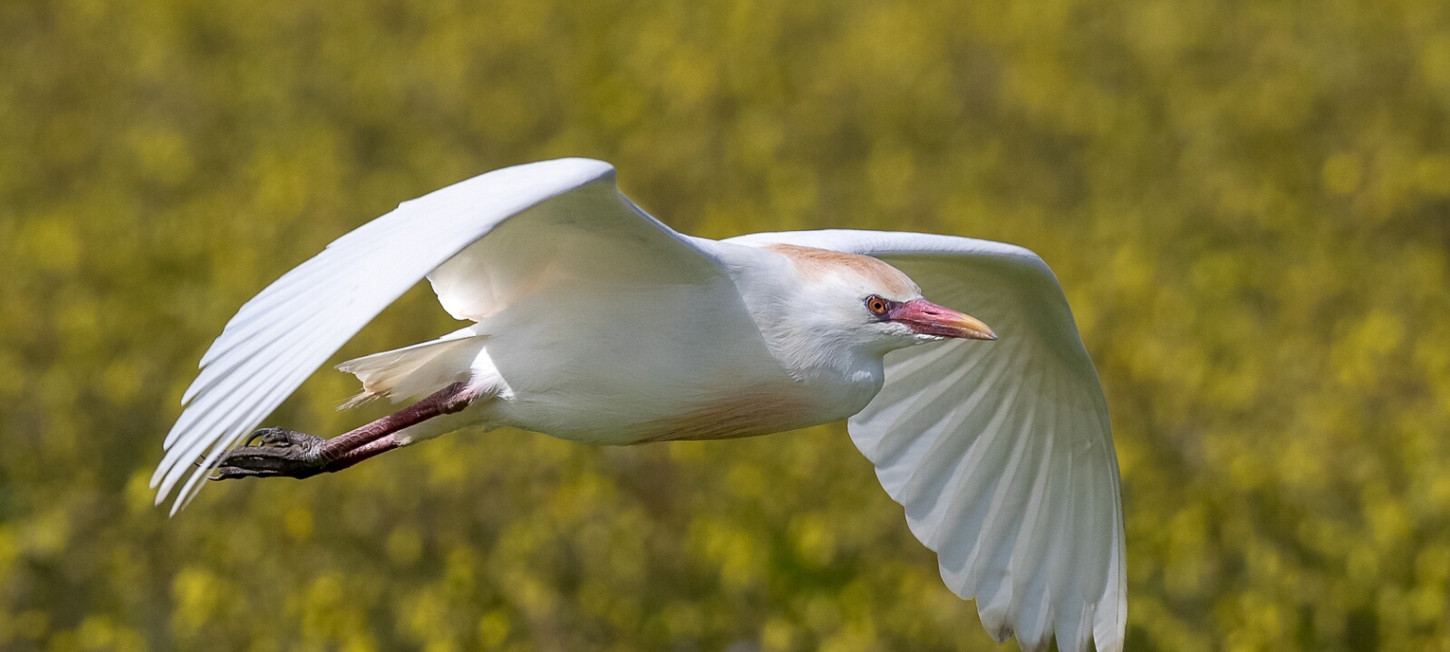 Der Kuhreiher erreicht eine Körperlänge von 46 bis 56 cm und wiegt zwischen 300 und 400 gr. Die Flügelspannweite beträgt 88 bis 96 cm. Auf den ersten Blick erinnert der Kuhreiher an den Rallenreiher, der jedoch etwas dunkler und kleiner ist. Ausgewachsene Tiere besitzen ein hauptsächlich weißes Gefieder, einen gelben Schnabel und gelbe Beine. Außerhalb der Fortpflanzungszeit ist die Augenumgebung grünlich bis gelb. Im Prachtkleid zur Brutzeit trägt der Kuhreiher Federbüschel auf dem Kopf und rotbräunlich gefärbte Federn auf Rücken, Brust und Kopf. Die Augenumgebung ist dann blau, während der Hochbalz ist außerdem der Schnabel und die Zügel rötlich. Quelle: Wikipedia