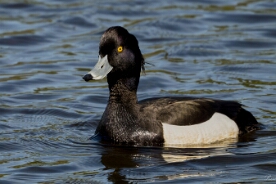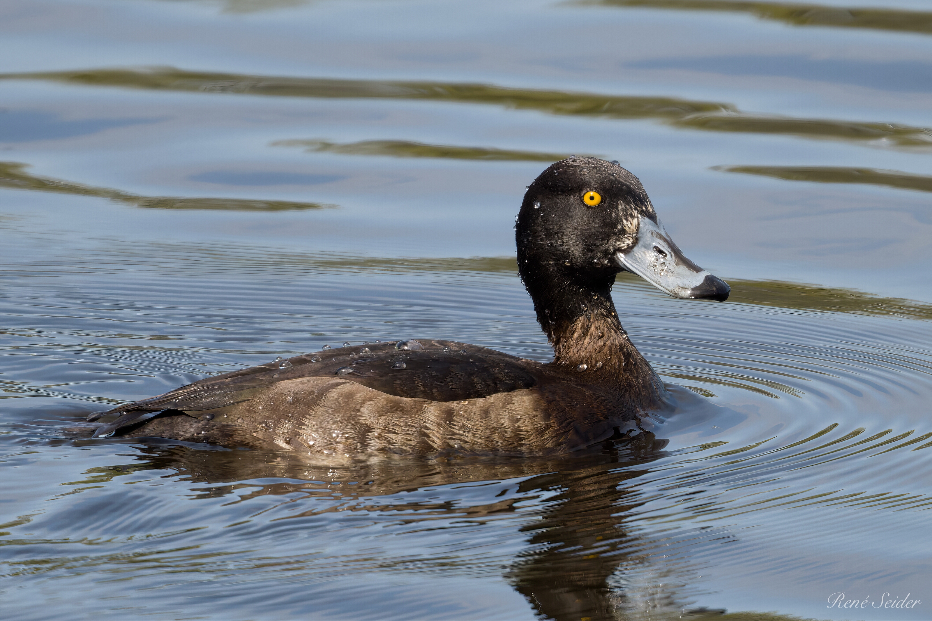 Die Reiherente (Aythya fuligula) ist eine Vogelart aus der Familie der Entenvögel. Sie zählt zu den so genannten Tauchenten. Es handelt sich um eine verhältnismäßig kleine, kompakt gebaute Ente. Auffällig sind der verhältnismäßig kurze Schnabel und der auffällig runde Kopf. Die Männchen haben am Hinterkopf einen langen, herabhängenden Schopf. Das Weibchen weist eine kurze Holle auf. Die Reiherente ist in Mitteleuropa ein verbreiteter Brut- und Jahresvogel. Quelle: Wikipedia