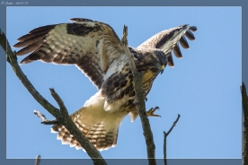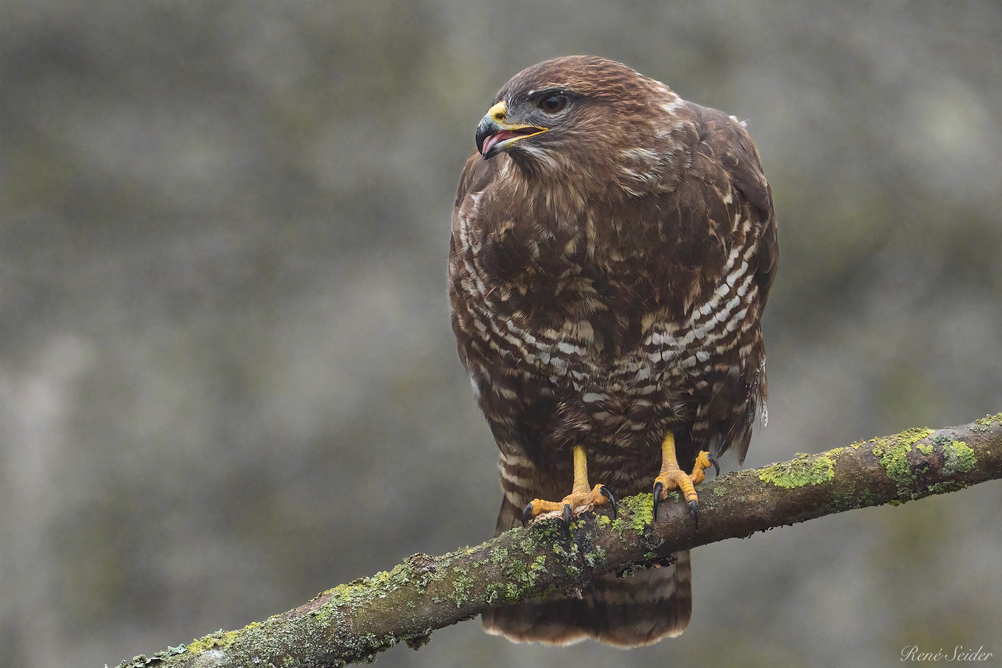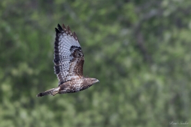 Der Mäusebussard (Buteo buteo) ist ein Greifvogel aus der Familie der Habichtartigen und der häufigste Vertreter dieser Familie in Mitteleuropa. Er ist mittelgroß und kompakt, das Gefieder variiert von Dunkelbraun bis fast Weiß. Er kann oft bei seinen kreisenden Segelflügen oder bei der Ansitzjagd beobachtet werden. Sein Lebensraum sind offene Landschaften wie Wiesen, Äcker und Heide mit angrenzenden Waldgebieten, in denen er sein Nest baut. Er ist 51 bis 57 cm lang und hat 113 bis 128 cm Flügelspannweite. Quelle: Wikipedia