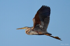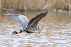 Der Purpurreiher (Ardea purpurea) ist eine Vogelart aus der Familie der Reiher. Er ist ein seltener Brutvogel und wird in der Roten Liste in Kategorie 2 (stark gefährdet) geführt. Der Purpurreiher hat eine Körperlänge von 70 bis 90 cm (mit gestrecktem Hals) und eine Spannweite von 107 bis 143 cm. Damit ist er kleiner als der Graureiher, dem er im Flug zwar ähnelt, sich jedoch durch seine Färbung und seine wesentlich längeren, im Flug oft gespreizten Zehen unterscheidet. Weiterhin sind die Beine und der dünnere, weniger dolchartige Schnabel matt gelb, der Schnabelfirst ist dunkel. Die Basis des Oberschnabels ist hell. Der Kopf ist kleiner und geht flacher von der Stirn in den Schnabel über als beim Graureiher. Die Iris ist gelb. Im ersten Sommer ähneln Hals und Oberseite den Altvögeln, jedoch sind die Flügeldecken noch braun gescheckt. Beim Flug ist der Hals s-förmig gekrümmt. Die Schlagfrequenz ist höher als beim Graureiher. Quelle: Wikipedia
