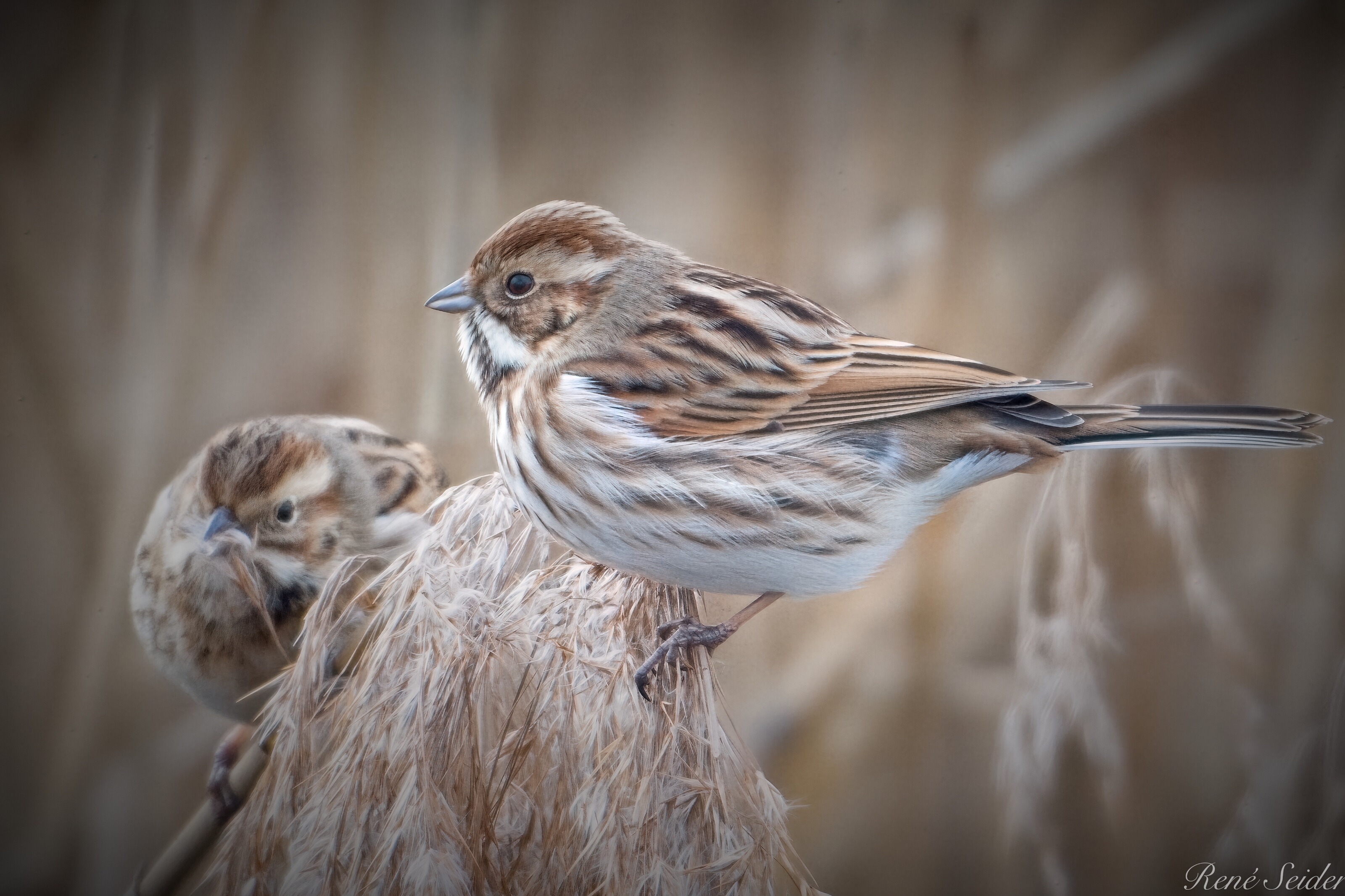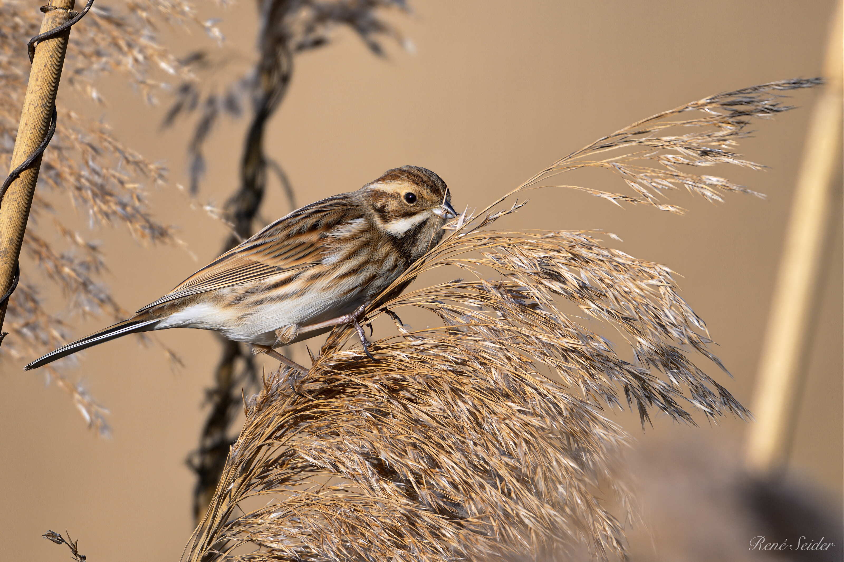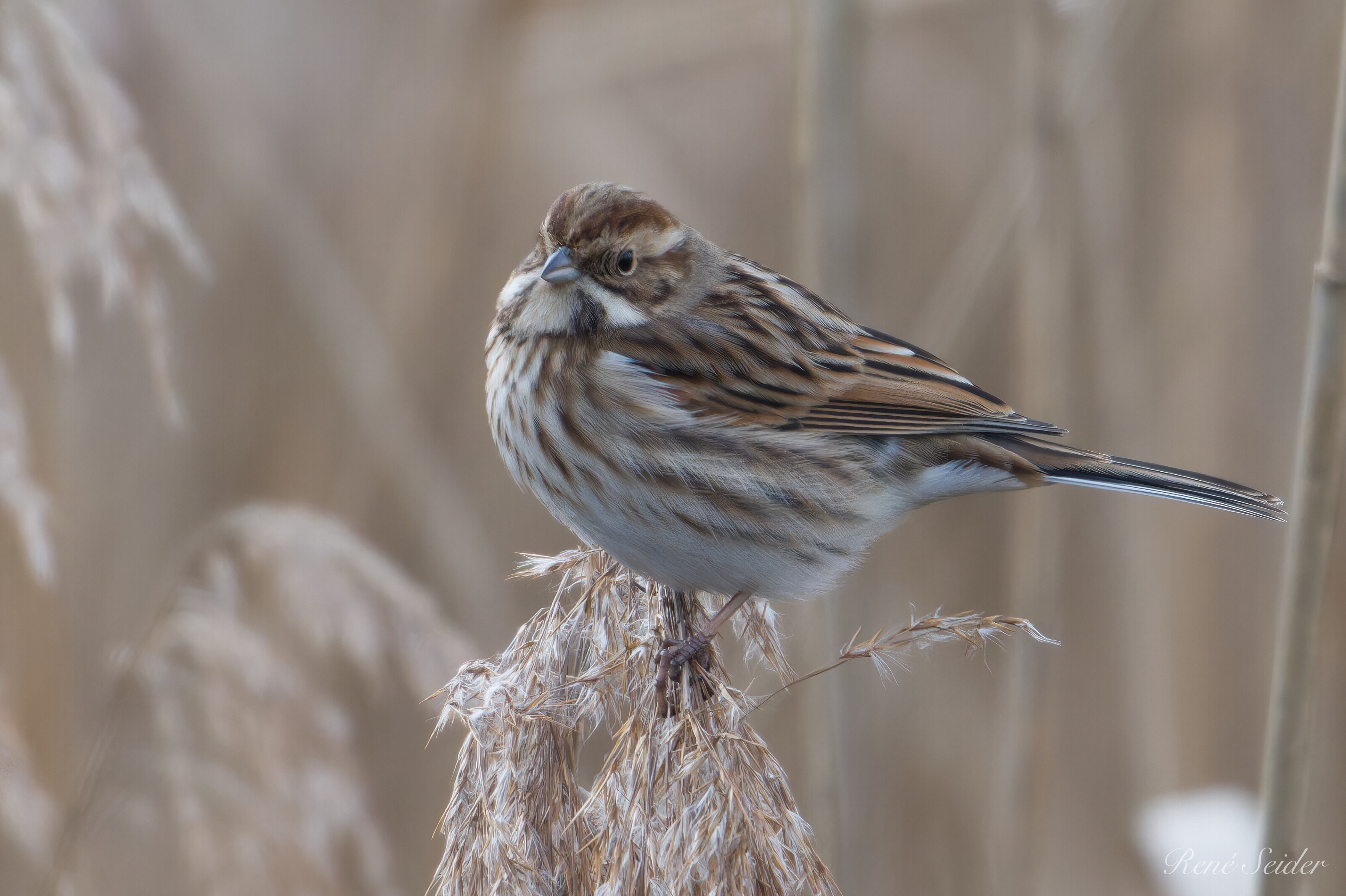 Die Rohrammer ist etwa 13–16 cm lang. Beim Männchen sind im Prachtkleid Kopf und Kehle schwarz, das Nackenband weiß, der Rücken dunkelbraun gestreift, der Bürzel gräulich, die Unterseite gräulich-hell. Nach der Herbstmauser ist diese kontrastreiche Färbung durch graue Federsäume verdeckt und kommt im Verlauf des Winters nach Verschleiß der Federränder wieder zum Vorschein. Das Weibchen ist braun gestreift mit schwarzweißem Bartstreif, die Unterseite heller. Es lässt sich auf dem Zuge nur schwer bestimmen, besonders, wenn man es allein antrifft. Die Rohrammer ernährt sich vorzugsweise von Grassamen und zusätzlich im Sommer von kleinen Insekten, Schnecken und Würmern. Quelle: Wikipedia
