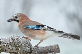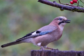 Der Eichelhäher ist ein Singvogel aus der Familie der Rabenvögel. Der Eichelhäher gehört mit 32 bis 35 cm Körperlänge zu den mittelgroßen Rabenvögeln, seine Flügelspannweite beträgt etwa 53 cm und sein Gewicht etwa 170 gr. Er brütet in lichten, strukturreichen Wäldern aller Art, in Mitteleuropa aber bevorzugt in Misch- und Laubwäldern. Sein Nahrungsspektrum ist sehr vielfältig, wobei im Sommerhalbjahr tierische, im Winterhalbjahr pflanzliche Nahrung überwiegt. Vor dem Winter werden umfangreiche Vorräte aus Eicheln und anderen Nussfrüchten angelegt. Quelle: Wikipedia