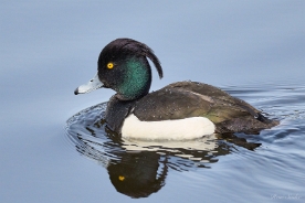 Die Reiherente (Aythya fuligula) ist eine Vogelart aus der Familie der Entenvögel. Sie zählt zu den so genannten Tauchenten. Es handelt sich um eine verhältnismäßig kleine, kompakt gebaute Ente. Auffällig sind der verhältnismäßig kurze Schnabel und der auffällig runde Kopf. Die Männchen haben am Hinterkopf einen langen, herabhängenden Schopf. Das Weibchen weist eine kurze Holle auf. Die Reiherente ist in Mitteleuropa ein verbreiteter Brut- und Jahresvogel. Quelle: Wikipedia