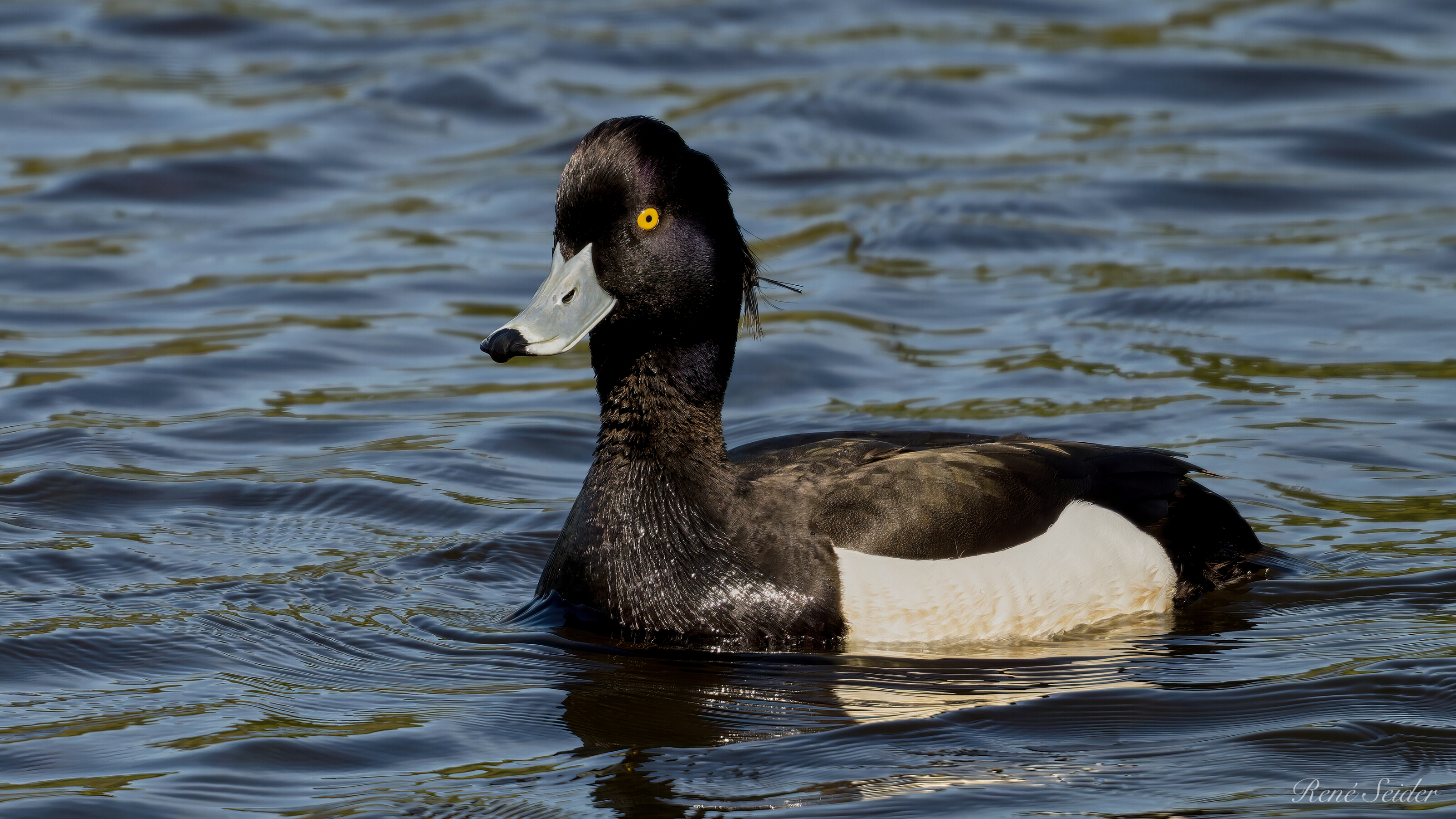 Die Reiherente (Aythya fuligula) ist eine Vogelart aus der Familie der Entenvögel. Sie zählt zu den so genannten Tauchenten. Es handelt sich um eine verhältnismäßig kleine, kompakt gebaute Ente. Auffällig sind der verhältnismäßig kurze Schnabel und der auffällig runde Kopf. Die Männchen haben am Hinterkopf einen langen, herabhängenden Schopf. Das Weibchen weist eine kurze Holle auf. Die Reiherente ist in Mitteleuropa ein verbreiteter Brut- und Jahresvogel. Quelle: Wikipedia
