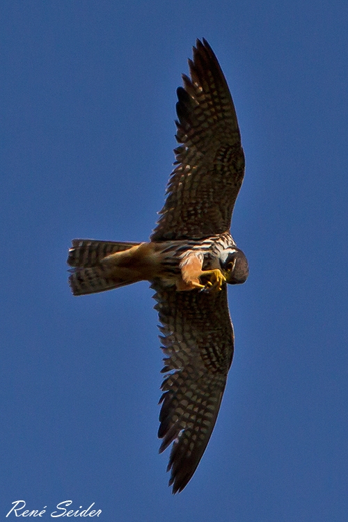 Der Baumfalke (Falco subbuteo) ist ein kleiner Falke, dessen auffälligstes Merkmal seine rostroten „Hosen“ (Beingefieder und Unterschwanzdecken) sind. Der Baumfalke wird zwischen 30 und 36 cm lang, das Weibchen ist größer als das Männchen. Die Oberseite ist dunkel schiefergrau, die Unterseite streifig gefleckt. Die Wangen sind weiß mit einem deutlichen Bartstreif. Im Flugbild erinnert er an einen überdimensionierten Mauersegler mit schmalen, spitzen, sichelförmig gebogenen Flügeln und relativ kurzem Schwanz. Quelle: Wikipedia