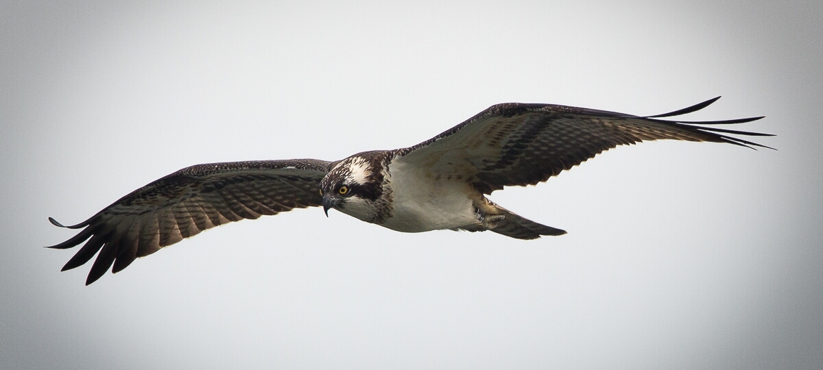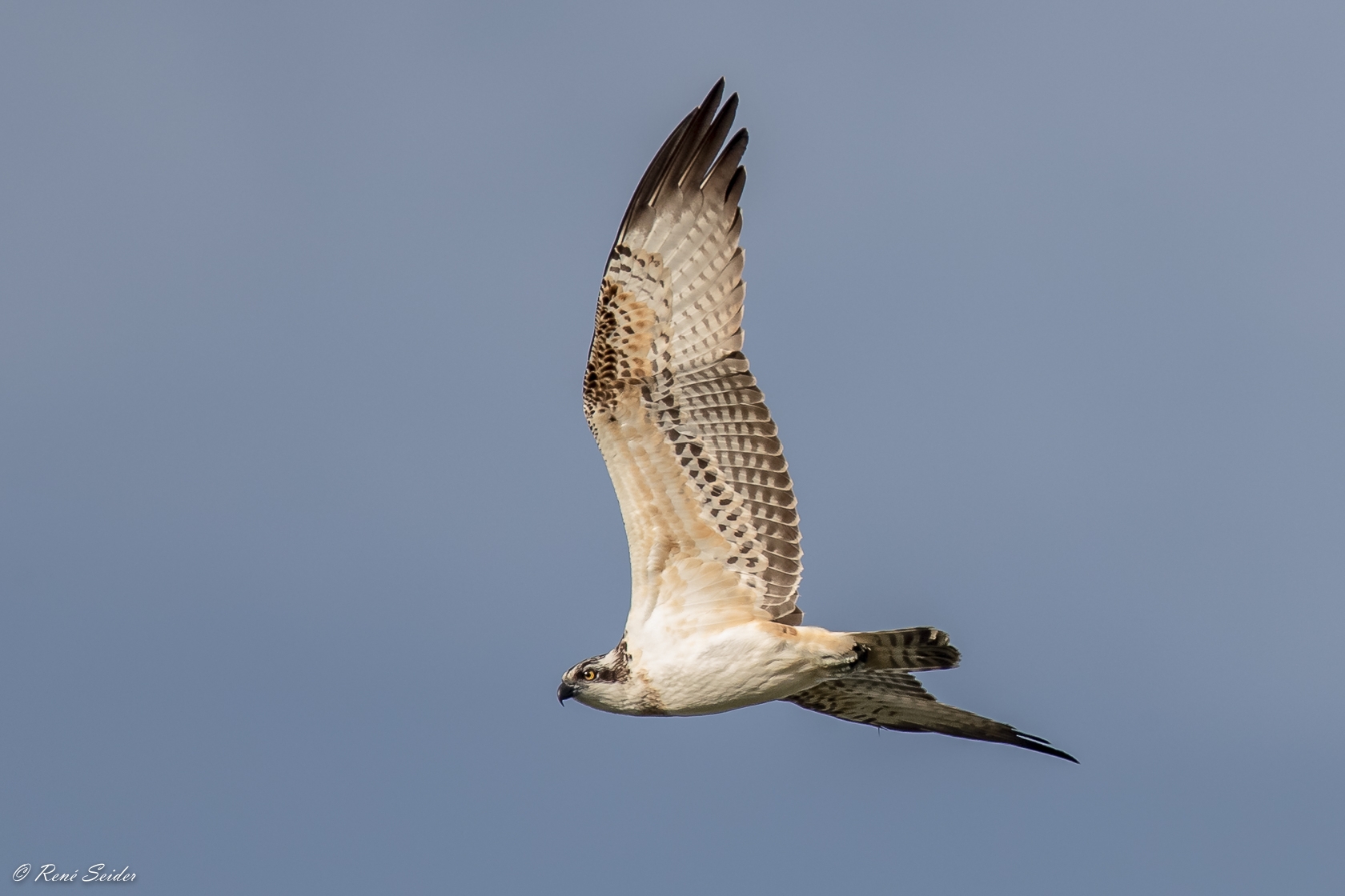 Der Fischadler (Pandion haliaetus) ist eine Vogelart aus der Ordnung der Accipitriformes. Fischadler sind mittelgroße, schlanke und langflügelige Greifvögel. Die Körperlänge beträgt 50 bis 66 cm, die Flügelspannweite beträgt 1,27 bis 1,74 m. Weibchen sind im Mittel größer und schwerer als Männchen. Weibchen der Nominatform P. h. haliaetus haben eine Flügellänge von 470 bis 518 mm und ein Gewicht von 1,21 bis 2,05 kg, Männchen erreichen eine Flügellänge von 448 bis 495 mm und ein Gewicht von 1,12 bis 1,74 kg. Quelle: Wikipedia