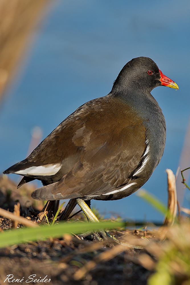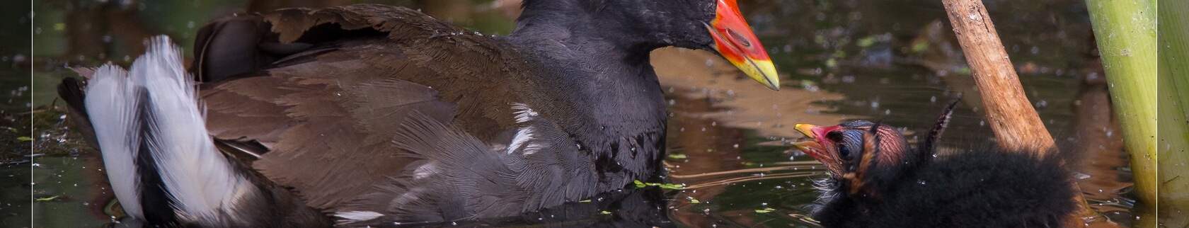 Das Teichhuhn (Gallinula chloropus), häufig auch Teichralle genannt, ist eine Art aus der Familie der Rallenvögel. Die in Europa vorkommende Unterart des Teichhuhns ist mit einer Körperlänge von etwa 33 cm etwas kleiner als ein Rebhuhn. Die Altvögel sind an der Körperoberseite dunkel olivbraun und an Kopf und Hals sowie der Körperunterseite dunkel grauschwarz gefärbt. Sie haben eine rote Stirnplatte, einen roten Schnabel mit einer gelben Schnabelspitze sowie rote Augen. Der Schwanz ist kurz und hat eine schwarzweiße Unterdecke. Quelle: Wikipedia