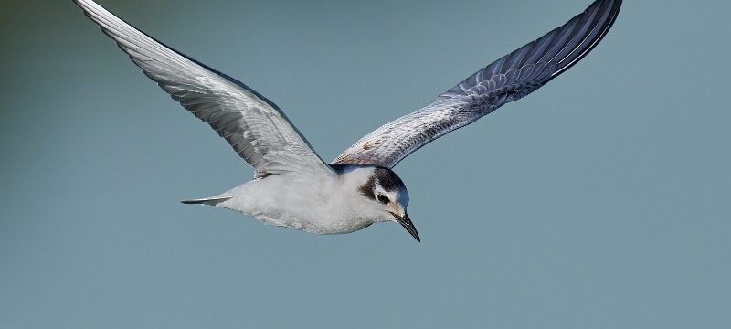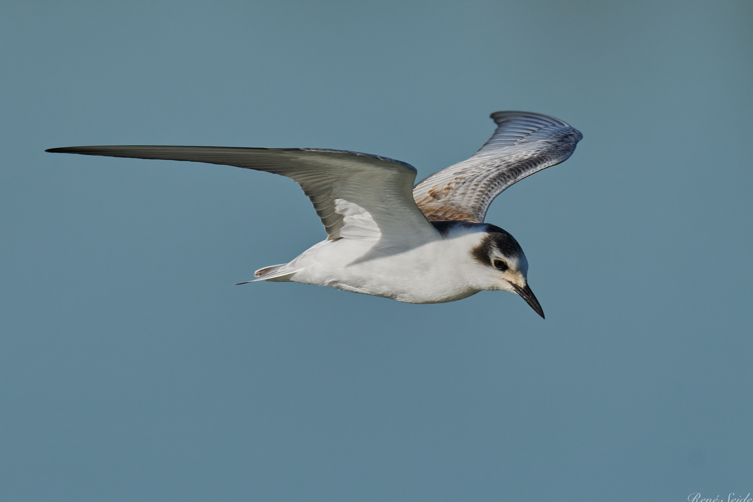 Das Männchen der Weißflügelseeschwalbe hat einen schwarzen Kopf, Hals und Vorderrücken. Ein dunkles Grau zeigen Schultergefieder, Rücken und Unterseite bis zum Hinterbauch. Der Bürzel, Ober- und Unterschwanzdecken sowie die Steuerfedern sind weiß. Die Armschwingen und die große Oberflügeldecken sind schiefergrau, die mittlere Decken heller grau und die kleinen Oberflügeldecken weiß. Die Bugfederchen und hinterste Reihe der Unterflügeldecken sind hell grau, alle übrigen Unterflügeldecken wie die Achselfedern schwarz. Die Flügelspannweite beträgt zwischen 595 und 656 mm. Der Schnabel ist etwas kürzer und gedrungener als bei der ähnlichen Trauerseeschwalbe. Die Kopfzeichnung zeigt eine über das Auge nach vorn reichende schwärzliche, schmal weiß gestrichelten Kopfplatte mit etwas schmalerem Nackenschutz, welche gegen das graue Mantelgefieder durch ein schmales, weißes Halsband abgegrenzt wird. Ein sehr deutliches weißes ovales bis rechteckiges Ohrfeld setzt den Kopf von der schwarzen Ohrdecke und den Schläfendecken ab. Gelegentlich verfügt die Seeschwalbe über einen Brustseitenfleck, der aber nur schwach ausgeprägt ist und weniger deutlich als bei der Trauerseeschwalbe. Quelle: Wikipedia