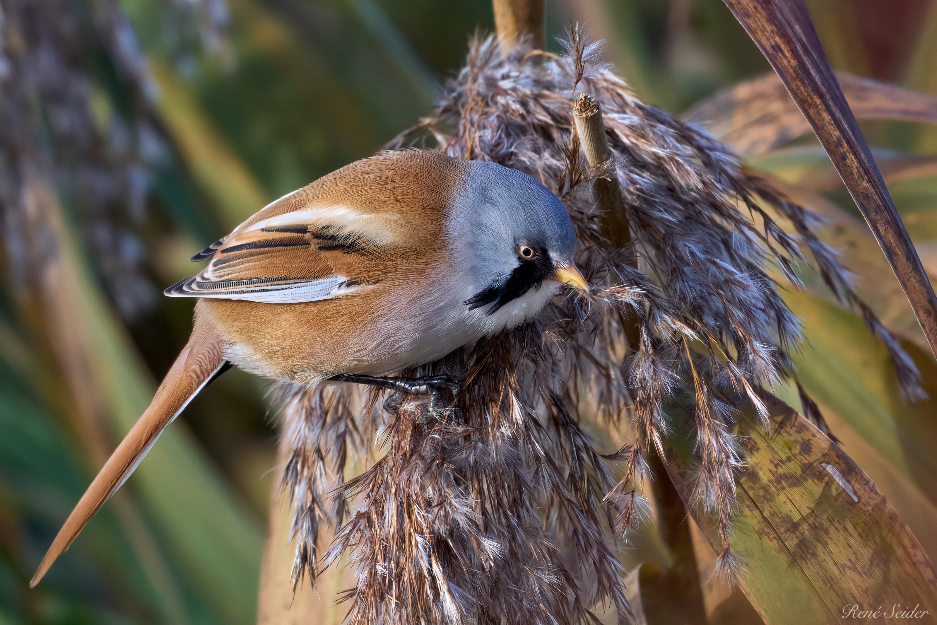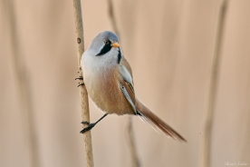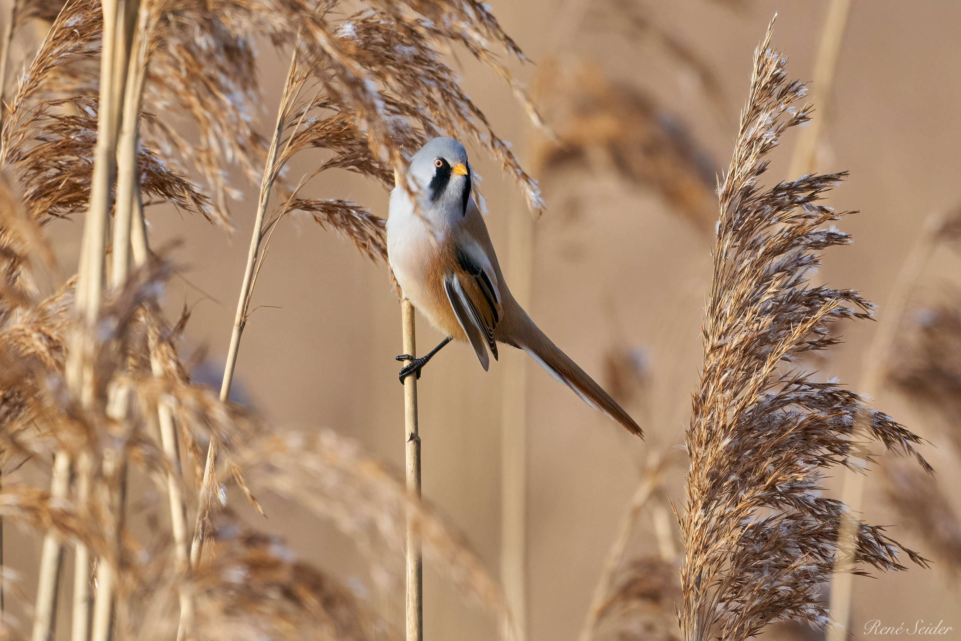 Die Bartmeise ist eine Vogelart und wird heute meist als einzige Art der damit monotypischen Panuridae betrachtet. Sie ist ein meisenartiger, langschwänziger Bewohner großer Schilfflächen. Ihre Länge beträgt zwischen 14 und 15,5 cm. Sie ist klein, hell gelbbraun und hat einen hell gelbbraunen Schwanz. Das adulte Männchen besitzt einen hell blaugrauen Kopf mit langem schwarzen Bartstreif und weißer Kehle. Bei dem adulten Weibchen dagegen ist der Kopf beigebraun ohne schwarzen Bart. Die Kehle ist schmutzigweiß und die Unterschwanzdecken sind beige. Jungvögel ähneln adulten Weibchen, haben jedoch eine schwarze Mantelmitte und schwarze Bereiche im Schwanz. Ihr Gefieder ist eher gelbbeige. Quelle: Wikipedia