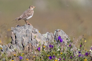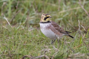 Die Ohrenlerche (Eremophila alpestris) ist im Sommer durch eine Gesichtsmaske und „Teufelshörner“, die beim Weibchen kürzer sind, unverwechselbar. Die…