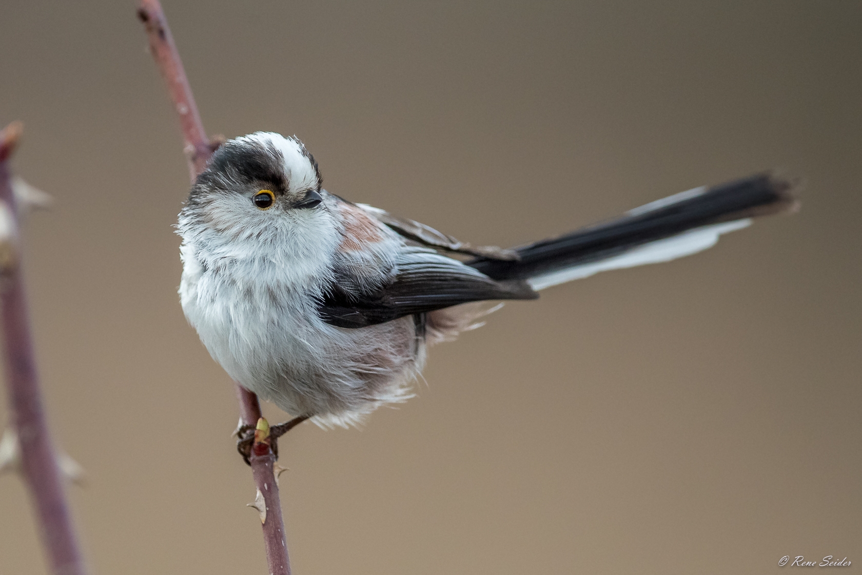 Die Schwanzmeise (Aegithalos caudatus Europäus) ist ein kleiner Sperlingsvogel aus der Familie der Schwanzmeisen. Die Kopfzeichnung ändert sich mit der Unterart und der geographischen Verbreitung. Sie hat einen dunklen Kopf und findet sich vor allem im West- und Südeuropa. Die Aegithalos caudatus caudatus in Nord- u. Osteuropa ist weißköpfig. In Mitteleuropa können beide Formen nebeneinander vorkommen. Die Schwanzmeise ist mit 13–16 cm Gesamtlänge recht klein, hat einen rundlich-kugeligen Körper und einen mit 6–10 cm auffallend langen Schwanz, worauf der Artname zurückgeht. Der schwarze Schnabel ist mit 6–7 mm Länge kurz und fein. Das Gewicht beträgt sieben bis zehn Gramm, die Flügellänge 6–7 cm. Quelle: Wikipedia