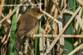 Der Teichrohrsänger (Acrocephalus scirpaceus), im Volksmund auch Rohrspatz genannt, ist eine Singvogelart aus der Gattung der Rohrsänger (Acrocephalus) und der Familie der Grasmückenartigen (Sylviidae). Der Teichrohrsänger ist etwa 13 cm lang und hat eine Flügelspannweite von 17 bis 21 cm. Das Gewicht beträgt etwa 10 bis 15 Gramm. Die Oberseite ist braun, sein Unterseite gelblichweiß. Der kleine Vogel hat eine weißliche Kehle, einen spitzen Schnabel und graubraune Beine. Männchen und Weibchen haben die gleiche Färbung. Die Schlagfrequenz seiner Flügel beträgt etwa 18 Schläge pro Sekunde, die Fluggeschwindigkeit 10 Meter pro Sekunde. Ein Teichrohrsänger kann bis 12 Jahre alt werden. Sein kurzer unauffälliger Ruf klingt wie „tscharr“ und „tschirrak“. Allein dem Aussehen nach ist der Teichrohrsänger nur schwer vom Sumpfrohrsänger zu unterscheiden. Quelle: Wikipedia
