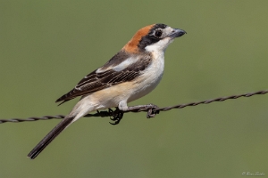 Der Rotkopfwürger (Lanius senator) ist ein Singvogel der Gattung Lanius aus der Familie der Würger (Laniidae). Mit einer Gesamtlänge von bis zu 19 cm, wovon etwa 8 cm auf den Schwanz entfallen, ist der Rotkopfwürger durchschnittlich nur geringfügig größer als der Neuntöter; er ist jedoch mit bis zu 50 gr um 10−20 Prozent schwerer als dieser und wirkt kompakter und massiger. Ausgefärbte Männchen sind auf der Oberseite weitgehend schwarz, auf der Unterseite sehr hell, fast weiß gefärbt. Scheitel und Nacken sind rostbraun, gelegentlich orangebraun. Die Geschlechter unterscheiden sich in Größe und Gewicht nicht, in der Färbung jedoch recht deutlich. Weibchen sind insgesamt blasser und weniger kontrastreich gefärbt. Quelle: Wikipedia