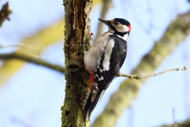 Der Buntspecht (Dendrocopos major) ist eine Vogelart aus der Familie der Spechte (Picidae). Der Buntspecht ist etwa 23 Zentimeter groß. Seine Flügelspannweite beträgt zwischen 34 und 39 Zentimeter. Er ist zwischen 60 und 90 Gramm schwer. Die Nahrung wird in allen Strata des Waldes gesucht, jedoch vor allem in den Baumkronen. Sie besteht sowohl aus tierischen Anteilen, als auch, vor allem im Winter, aus pflanzlichem Material. Das Nahrungspektrum ist sehr breit und umfasst verschiedenste Insekten und andere Wirbellose ebenso wie kleine Wirbeltiere und Vogeleier, Samen, Beeren und andere Früchte sowie Baumsäfte. Die Art ist häufig und der Bestand nimmt zumindest in Europa zu. Der Buntspecht wird von der IUCN daher als ungefährdet („least concern“) eingestuft. - Quelle: Wikipedia